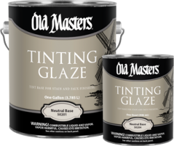 Application over Painted Surfaces (used as a glaze): Ensure painted basecoat is thoroughly dry. After tinting, apply the Tinting Glaze thinly over one section at a time using a clean cloth, sponge, or brush. Experiment with various methods of application to achieve the desired effect. To create an antique look, wipe off glaze lightly with a clean cloth, leaving a thin film on the surface and a heavier film in low spots and corners. If the glaze begins to set, add a little mineral spirits to the wiping cloth. For a faux finish, generously dab glaze with a sponge to simulate a marbleized effect. Realistic woodgrain patterns can be created by applying the glaze in conjunction with the Old Masters Wood Graining Tool. To enhance the beauty and wearing qualities, apply one or two coats of a clear finish. Do not top coat with lacquer.