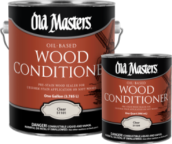 Some woods, such as pine, fir, maple, and poplar absorb stain unevenly creating a blotchy appearance. Old Masters Wood Conditioner is a clear wood sealer which enables uniform stain application under oil- or water-based stains. Apply stain over Wood Conditioner after 8 hours of dry time, or 24 hours if applying water-based stains. If the stain is applied before 8 hours, a darker color may result with less uniformity control. Ideal for use on soft woods which are being stained with or adjacent to hardwoods.