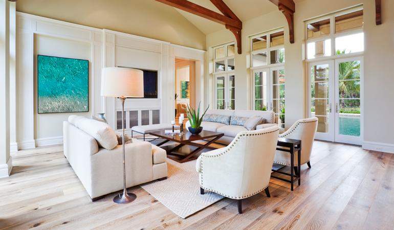 A daring design of white on white strikes the perfect chord in this inspiring space. Whitewashed floors take the room from predictable to unexpected. Symmetrically placed furniture forms a cozy gathering space around a tastefully contemporary coffee table. French doors and high transom windows draw the eye upward to the expansive ceiling.