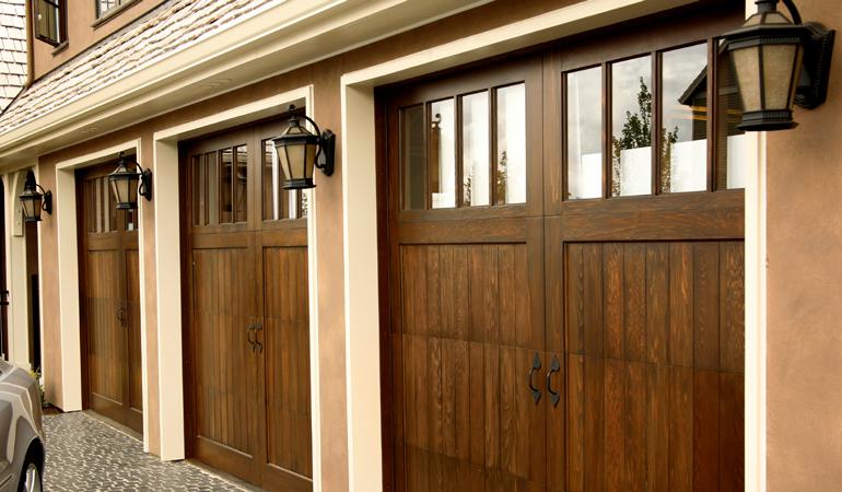 Wooden garage doors create drama and elegance on the exterior of this home. The use of wood creates a sense of old world tradition and brings added warmth and contrast to the buttercup stucco walls. The gray cobblestone drive creates a subtle foreground while white trim, wrought iron hardware, and craftsman style lanterns complete this high style exterior.