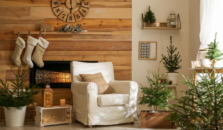 For a cozy yet minimal style, keep interiors fresh and light with a fresh coat of paint in Polished Marble. Natural wood furnishings and rustic Christmas décor enhance the space for a relaxing afternoon.